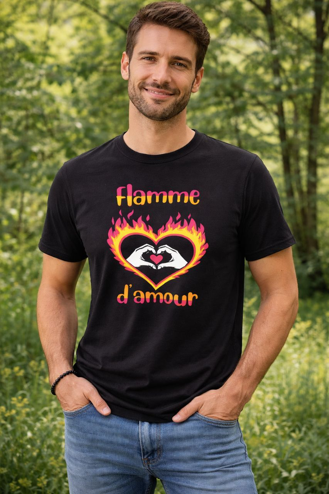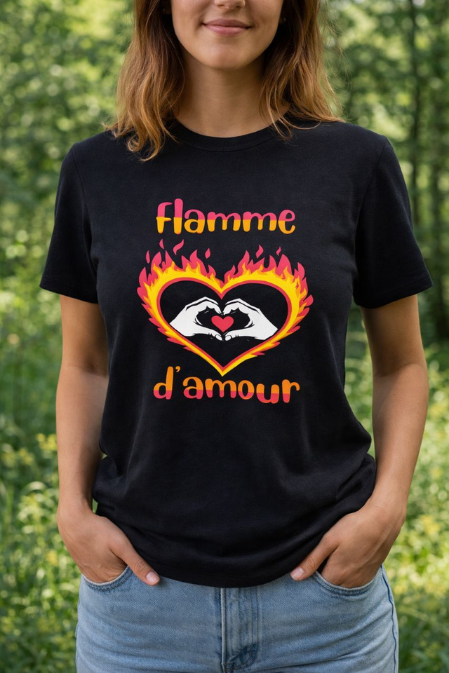 T-shirt noir avec motif “Flamme d’amour”, impression textile durable.